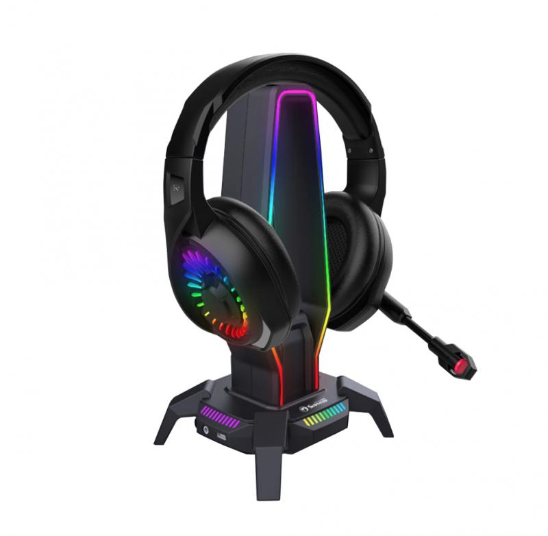 Headst holderRGB lighting with a lighting control buttonUSB powered with 1m cablewith USB2.0*3 and audio portproduct size 130*130*260mm